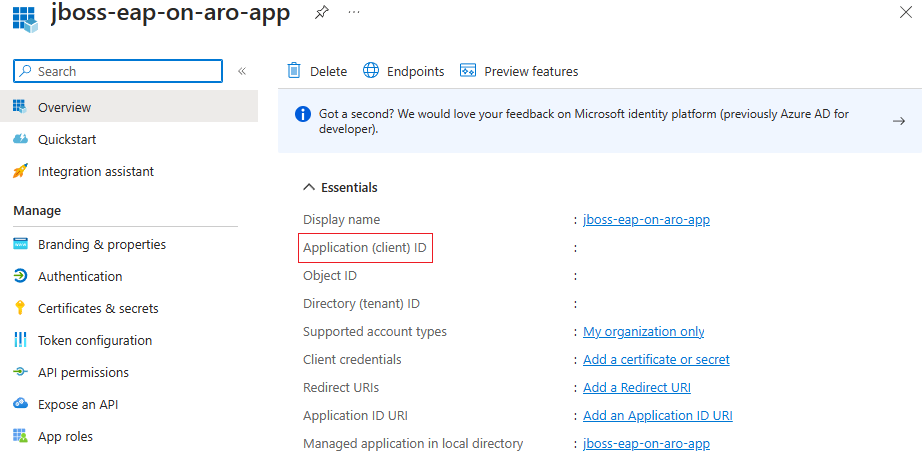 jboss-eap-on-aro-app. Selecione um tipo de conta suportado, que determina quem pode usar o aplicativo. Depois de definir os valores, selecione Registrar, conforme mostrado na captura de tela a seguir. Leva vários segundos para provisionar o aplicativo. Aguarde a conclusão da implantação antes de prosseguir.Salve o ID do aplicativo (cliente) na página de visão geral, conforme mostrado na captura de tela a seguir. Passe o ponteiro sobre o valor, que é editado na captura de tela, e selecione o ícone de cópia que aparece. A dica de ferramenta diz Copiar para área de transferência. Tenha cuidado para copiar o valor correto, pois os outros valores nessa seção também têm ícones de cópia. Salve a ID do aplicativo em um arquivo para que você possa usá-lo mais tarde.