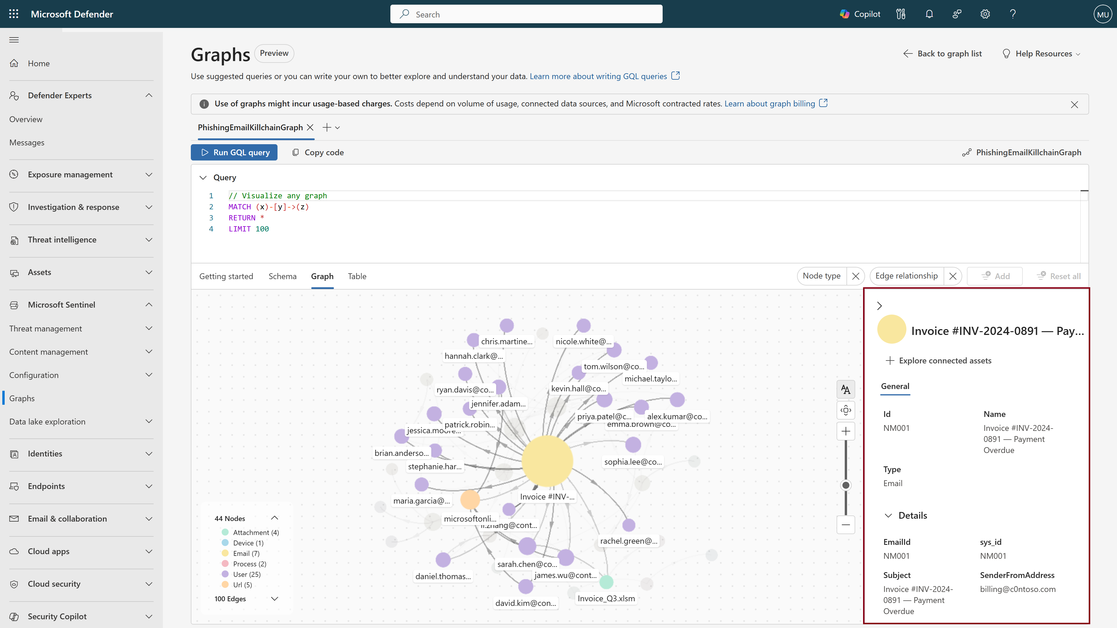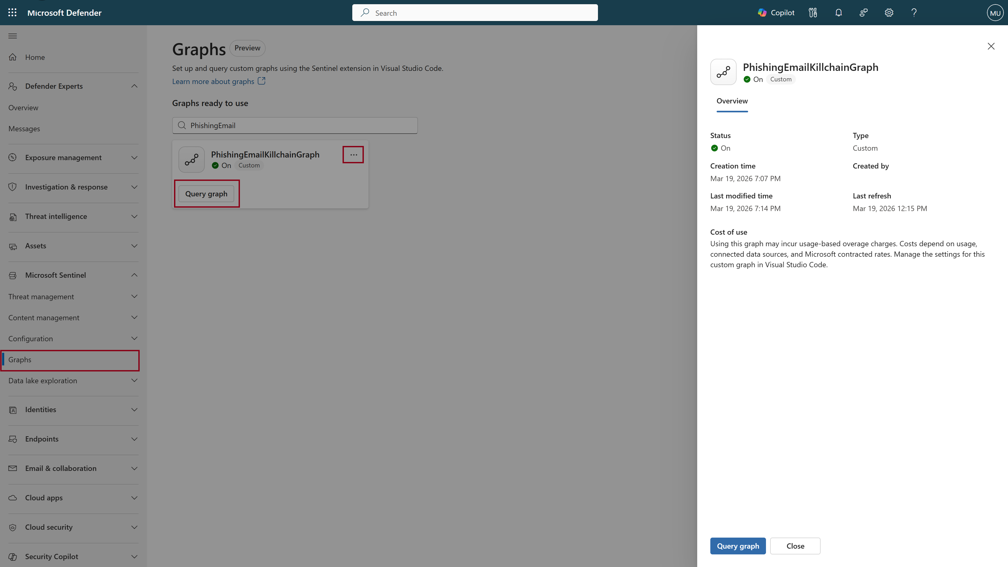 A experiência com grafos no portal Microsoft Defender permite-lhe realizar investigações interativas baseadas em grafos nos seus grafos personalizados, como usar um grafo concebido para análise de phishing que o ajude a avaliar rapidamente o impacto de um incidente recente, perfilar o atacante e traçar os seus caminhos através da telemetria Microsoft e dados de terceiros. Esta experiência permite-lhe executar consultas em grafos para visualizar os insights que mais importam para a sua organização e suporta a percorrência ad hoc do grafo para que possa investigar rapidamente as entidades de interesse. Pode estudar o esquema do grafo para compreender as relações definidas no seu gráfico e usar qualquer um dos metadados apresentados para restringir os seus resultados. Pode validar rapidamente os seus resultados com a vista de tabela e exportá-los para facilitar a integração em fluxos de trabalho pré-existentes. Use o Jupyter Notebooks no Microsoft Visual Studio Code para criar e materializar os seus grafos personalizados, depois use a experiência de grafos no Microsoft Sentinel para consultar e visualizar os seus grafos personalizados.
