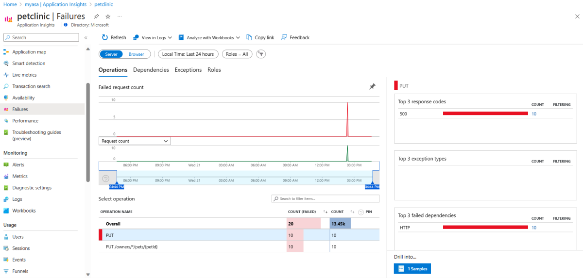 PUToperação com o maior número de solicitações com falha, selecione 1 Amostra para ver os detalhes e, em seguida, selecione a amostra sugerida.Vá para a página Detalhes da transação de ponta a ponta para visualizar a pilha completa de chamadas no painel direito.