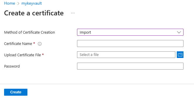 Na página Criar um certificado, selecione Importar para Método de Criação de Certificado e forneça um valor para Nome do Certificado.