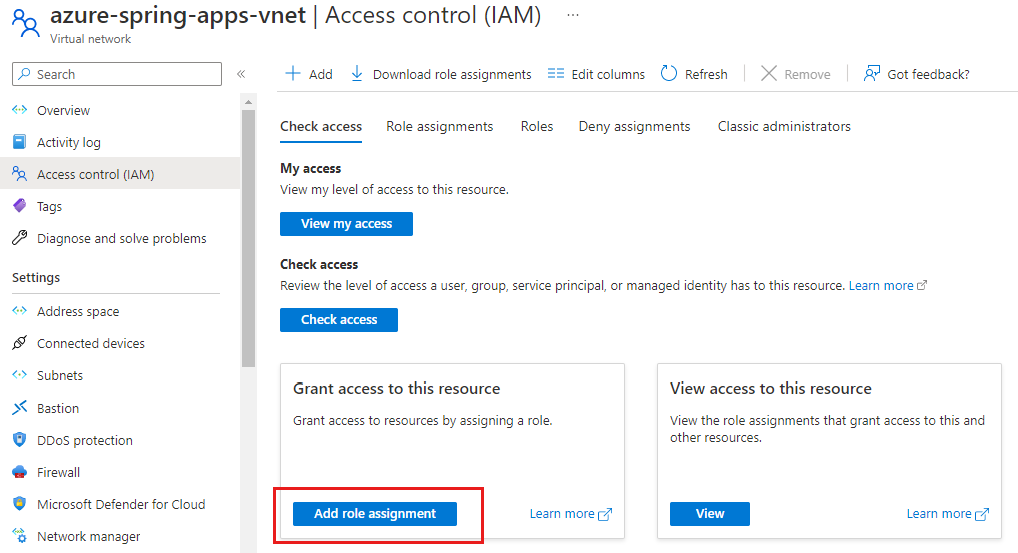 azure-spring-apps-vnetvirtual que você criou anteriormente.Selecione Controle de acesso (IAM) e, em seguida, selecione Adicionar>atribuição de função.