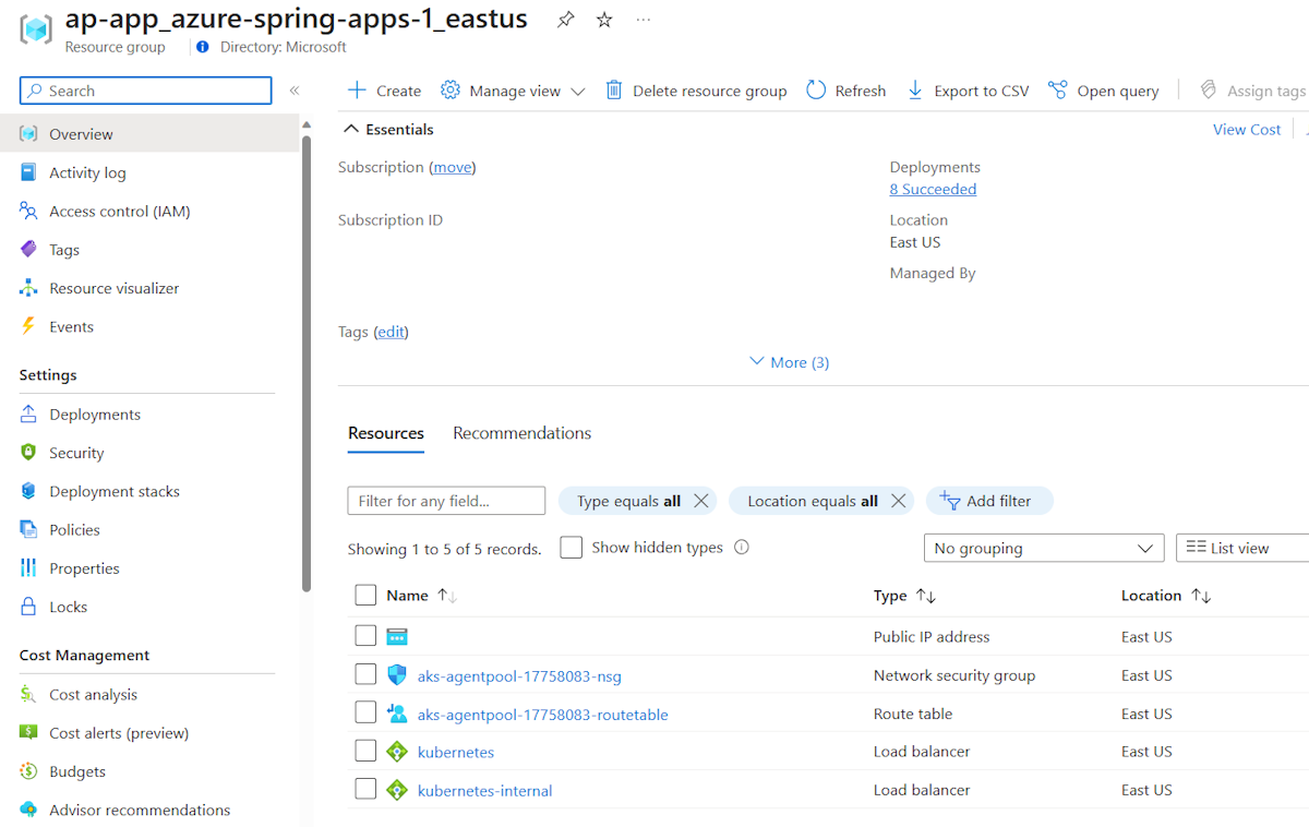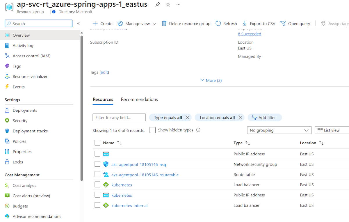 Os grupos de recursos são totalmente gerenciados pelo serviço Azure Spring Apps. Não exclua ou modifique manualmente nenhum recurso interno.