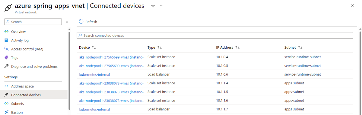 Em Nome em Detalhes do Serviço, selecione azure-spring-apps-vnet.
