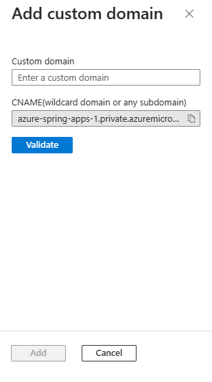 hello-vnet.azure-spring-apps-1.private.azuremicroservices.io. Você pode ignorar a parte CNAME.Selecione Validar.