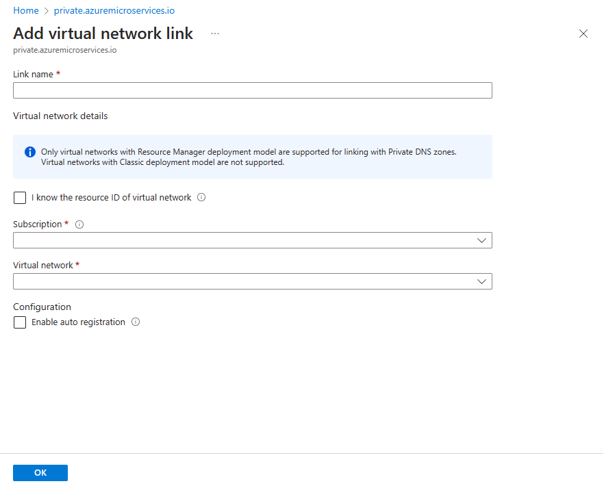 private.azuremicroservices.io. Pode haver vários com esse nome, portanto, determine o correto por seu grupo de recursos e assinatura.No painel de navegação, selecione Ligações de rede virtual e, em seguida, selecione Adicionar.