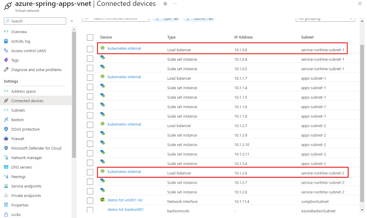 Navegue até a rede virtual que você criou para uma instância do Azure Spring Apps e selecione Dispositivos conectados no painel de navegação.