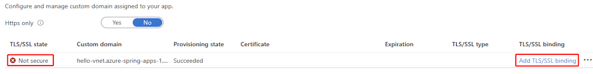Um valor de estado TLS/SSL de Não Seguro para seu domínio personalizado significa que ele ainda não está vinculado a um certificado TLS/SSL. Qualquer solicitação HTTPS de um navegador para seu domínio personalizado receberá um erro ou aviso.