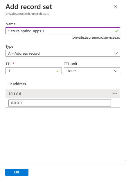 Configuração Valor Nome *.azure-spring-apps-1 Tipo A TTL 1 Unidade de TTL Horário endereço IP (colar da área de transferência) Selecione OK.