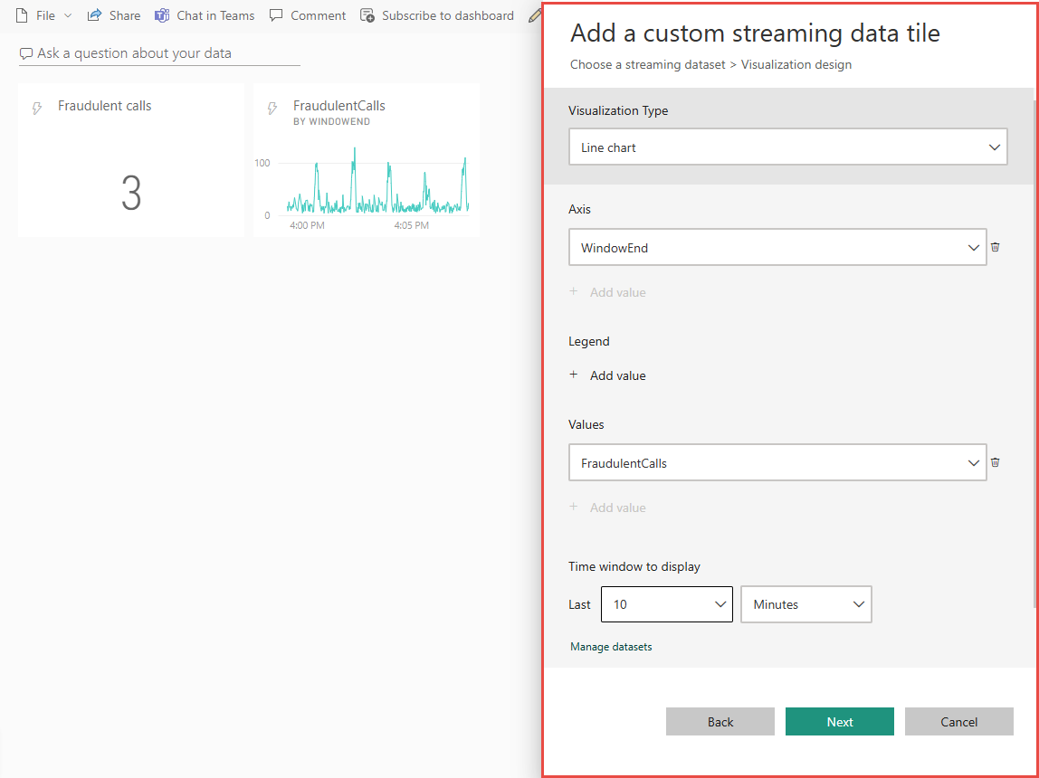 Selecione Cartão na lista suspensa Tipo de visualização, adicione chamadas fraudulentas a Campos e selecione Avançar.