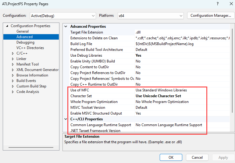 Quando você cria um projeto, o sistema atribui valores para várias propriedades. Os padrões variam um pouco, dependendo do tipo de projeto e das opções escolhidas no assistente do aplicativo. Por exemplo, um projeto ATL (Ative Template Library) tem propriedades relacionadas a arquivos MIDL (Microsoft Interface Definition Language), mas essas propriedades estão ausentes em um aplicativo de console básico. As propriedades padrão são mostradas no painel Avançado na janela Páginas de propriedades :