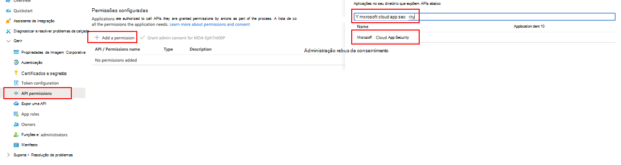 Para permitir que a sua aplicação aceda a Defender for Cloud Apps e atribua-lhe a permissão "Ler todos os alertas", na página da sua aplicação, selecione Permissões> da API Adicionar APIs depermissão> que aminha organização utiliza>, escreva Microsoft Cloud App Security e, em seguida, selecione Microsoft Cloud App Security.