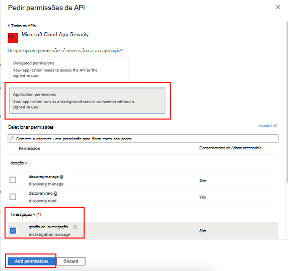 Selecione Application permissions>Investigation.Read e, em seguida, selecione Adicionar permissões.