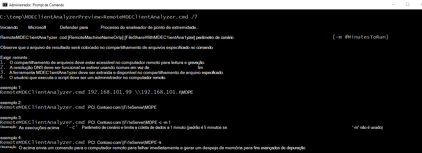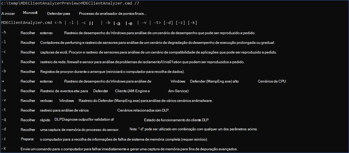 Execute MDEClientAnalyzer.cmd /? para ver a lista de parâmetros disponíveis e a respetiva descrição:
