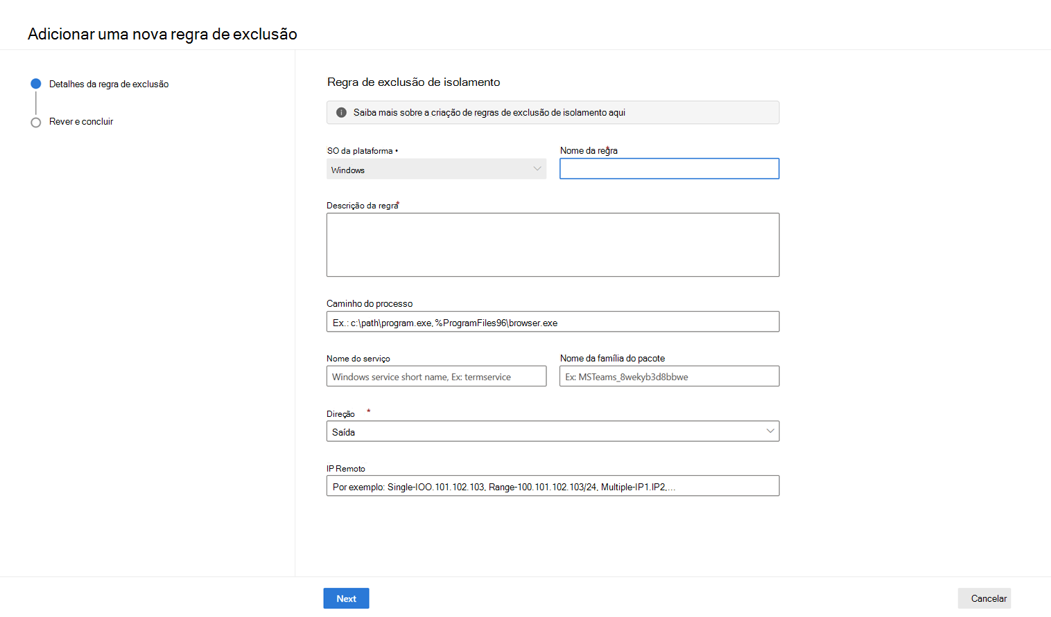 As exclusões de isolamento permitem que os processos ou pontos finais designados ignorem as restrições de isolamento de rede, garantindo que as funções essenciais (por exemplo, remediação remota ou monitorização) continuam ao mesmo tempo que limitam a exposição de rede mais ampla.
