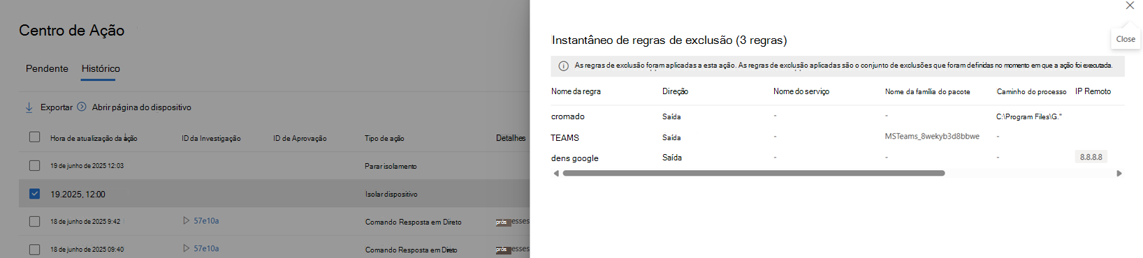 As exclusões que foram aplicadas a um dispositivo específico podem ser revistas no histórico do Centro de Ação.