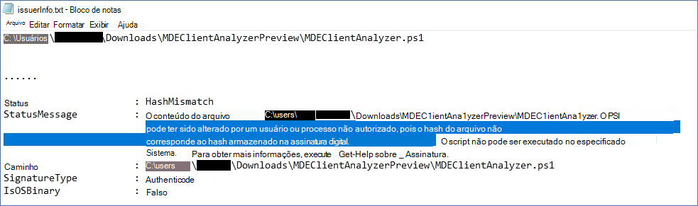 Todos os scripts e módulos do PowerShell incluídos no analisador são assinados pela Microsoft. Se os ficheiros foram modificados de alguma forma, espera-se que o analisador saia com o seguinte erro: