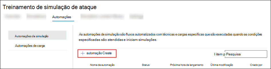 No portal de Microsoft Defender em https://security.microsoft.com/, aceda a Email & colaboração>Formação em simulação de ataques>Automatizações de simulação do separadorAutomations>. ou, para aceder diretamente ao separador Automatizações , onde pode selecionar Automatizações de simulação, utilize https://security.microsoft.com/attacksimulator?viewid=automations.