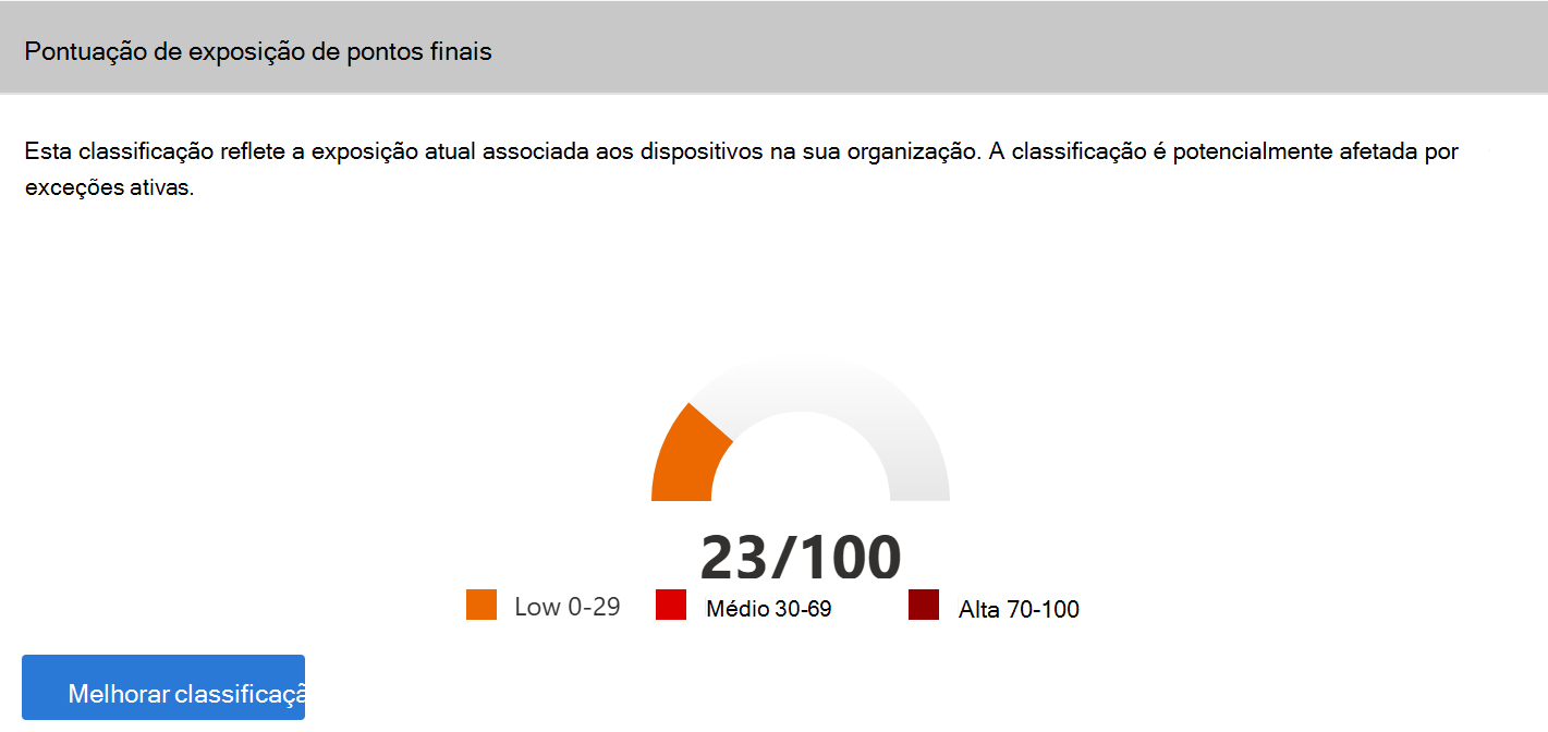 O cartão Pontuação de exposição a pontos finais na página DescriçãoGeral daGestão de vulnerabilidades da gestão>> de exposiçãoreflete a vulnerabilidade da sua organização às ameaças de cibersegurança. A baixa classificação de exposição significa que os seus dispositivos são menos vulneráveis à exploração.