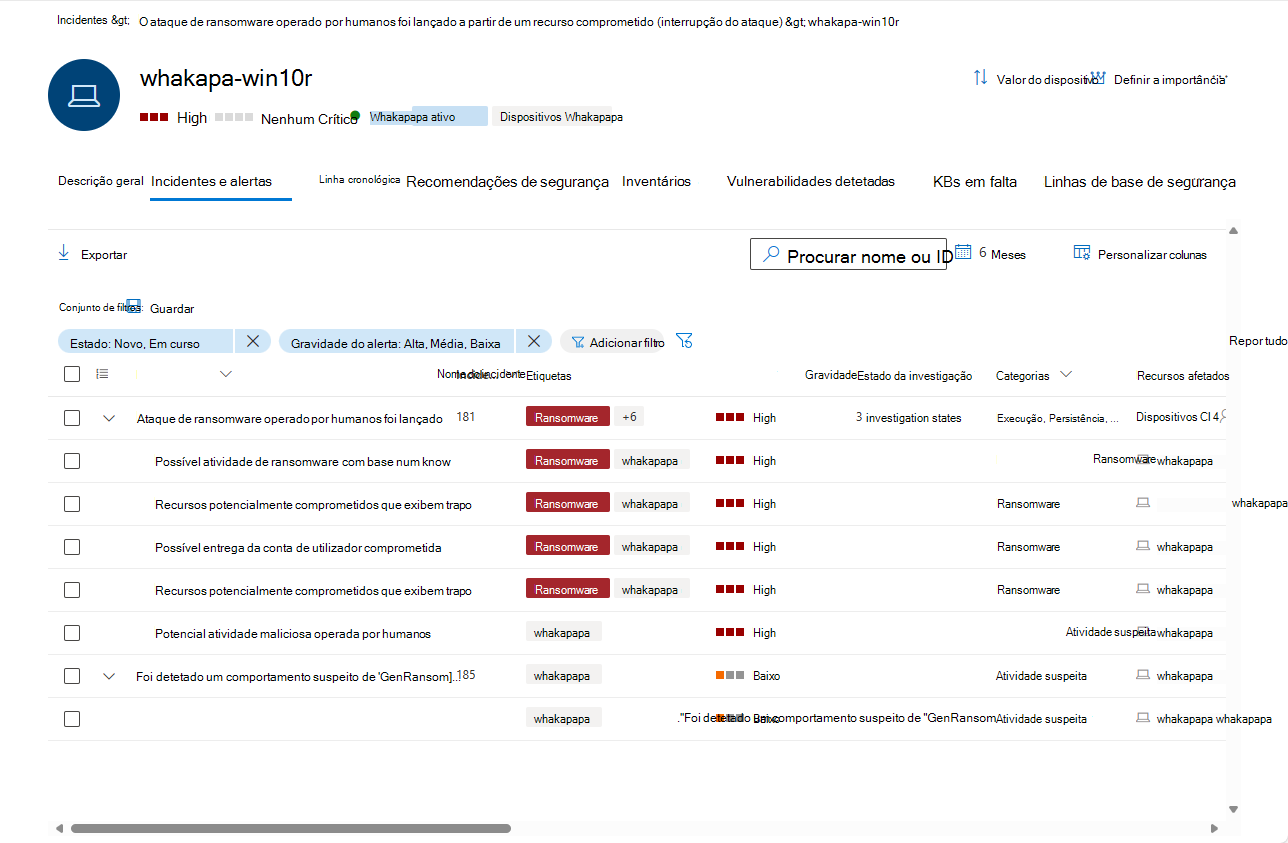 O separador Incidentes e alertas contém uma lista de incidentes que contêm alertas que foram gerados no dispositivo, de qualquer uma das Microsoft Defender origens de deteção, incluindo, se integrados, Microsoft Sentinel. Esta lista é uma versão filtrada da fila de incidentes e mostra uma breve descrição do incidente ou alerta, a sua gravidade (alta, média, baixa, informativa), o respetivo estado na fila (novo, em curso, resolvido), a classificação (não definido, alerta falso, alerta verdadeiro), estado de investigação, categoria, quem está atribuído para o resolver e última atividade observada.