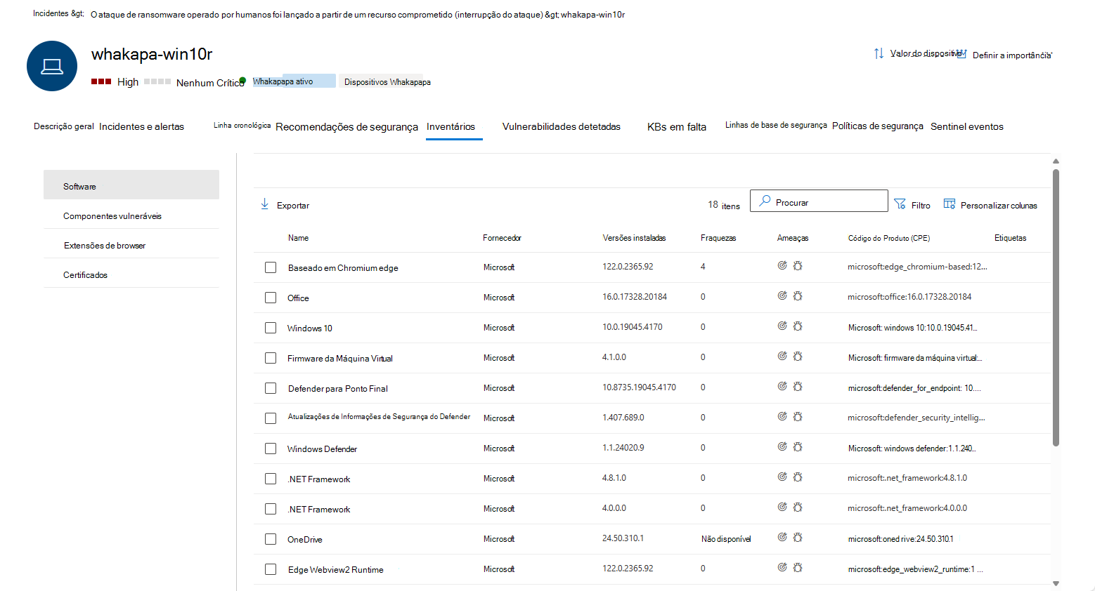 Este separador apresenta inventários de quatro tipos de componentes: Software, componentes vulneráveis, extensões de browser e certificados.