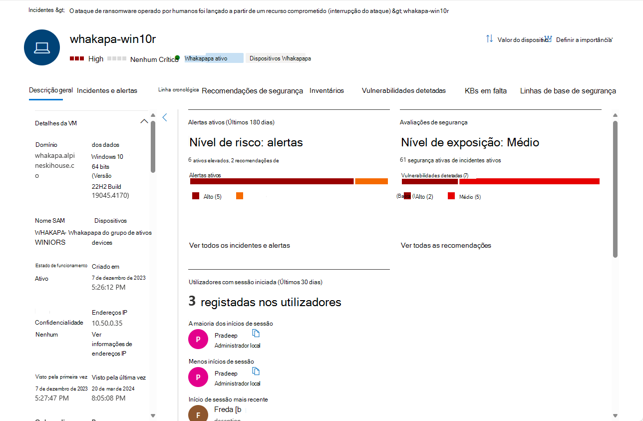 A página da entidade do dispositivo no portal Microsoft Defender ajuda-o na investigação de entidades do dispositivo. A página contém todas as informações importantes sobre uma determinada entidade de dispositivo. Se um alerta ou incidente indicar que um dispositivo está a comportar-se de forma suspeita ou pode estar comprometido, investigue os detalhes do dispositivo para identificar outros comportamentos ou eventos que possam estar relacionados com o alerta ou incidente e descubra o âmbito potencial da falha. Também pode utilizar a página da entidade do dispositivo para realizar algumas tarefas de segurança comuns, bem como algumas ações de resposta para mitigar ou remediar ameaças de segurança.