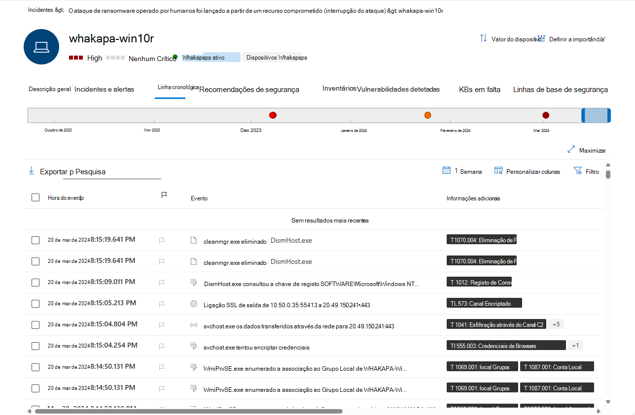 A partir de janeiro de 2025, se tiver integrado Microsoft Sentinel no portal do Defender, as atividades do dispositivo que aparecem na linha cronológica do Sentinel no separador Sentinel eventostambém são apresentadas aqui no separador Linha Cronológica principal, para que possam ser visualizadas em conjunto com eventos gravados por outros Microsoft Defender serviços num único contexto. Esta linha cronológica unificada ajuda a simplificar as investigações ao fornecer uma visão unificada das atividades do dispositivo, ao eliminar a necessidade de alternar entre ecrãs e ao permitir uma tomada de decisões mais rápida.