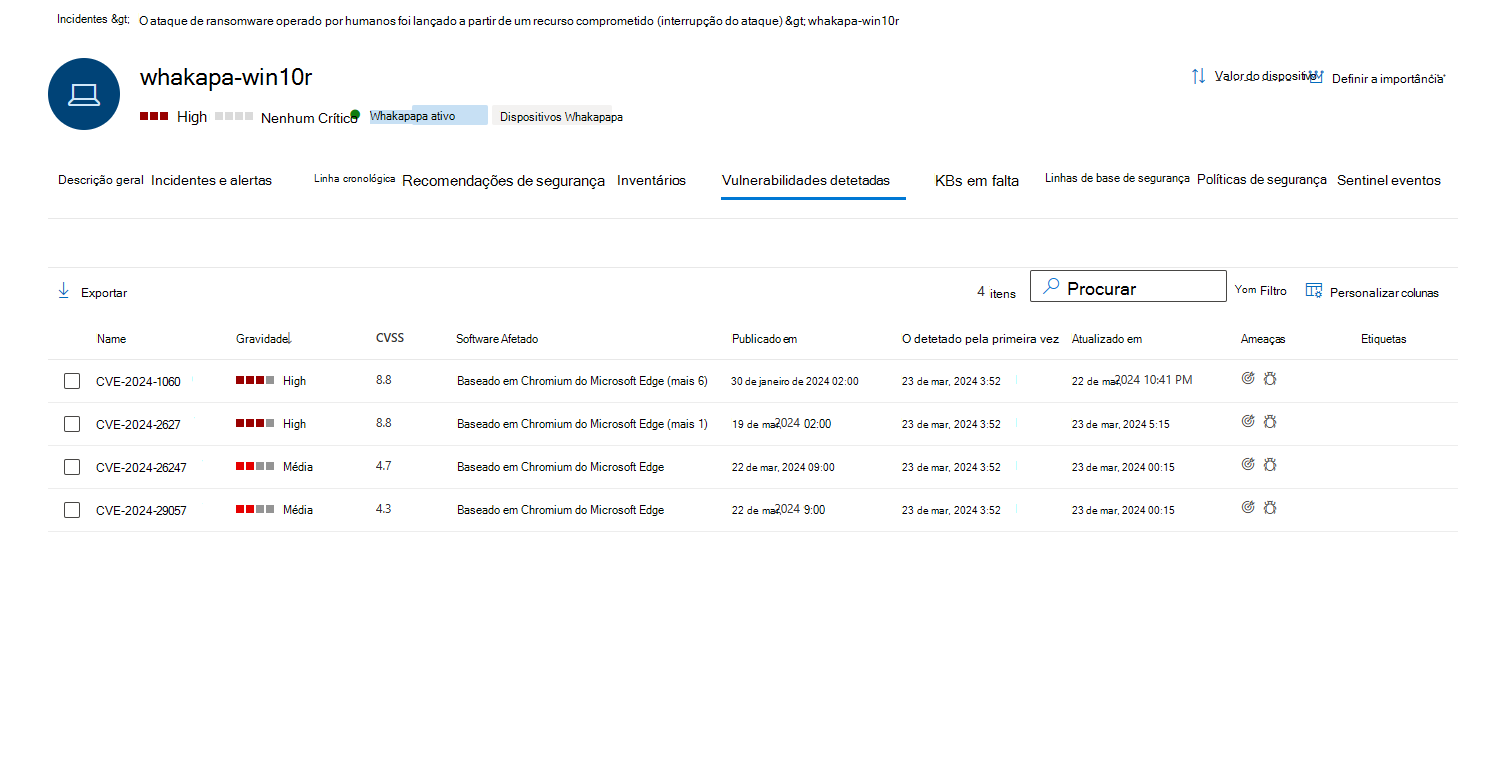 Tal como acontece com os separadores anteriores, a escolha das colunas a apresentar pode ser personalizada. A lista pode ser filtrada por gravidade, estado de ameaça, exposição do dispositivo e etiquetas.