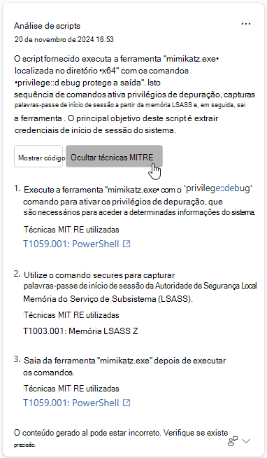 Selecione Mostrar técnicas MITRE para ver as técnicas MITRE ATT&CK associadas ao script. Estas informações ajudam-no a compreender as técnicas utilizadas pelo script e como podem afetar o seu ambiente. Selecione Ocultar técnicas MITRE para fechar a expansão.