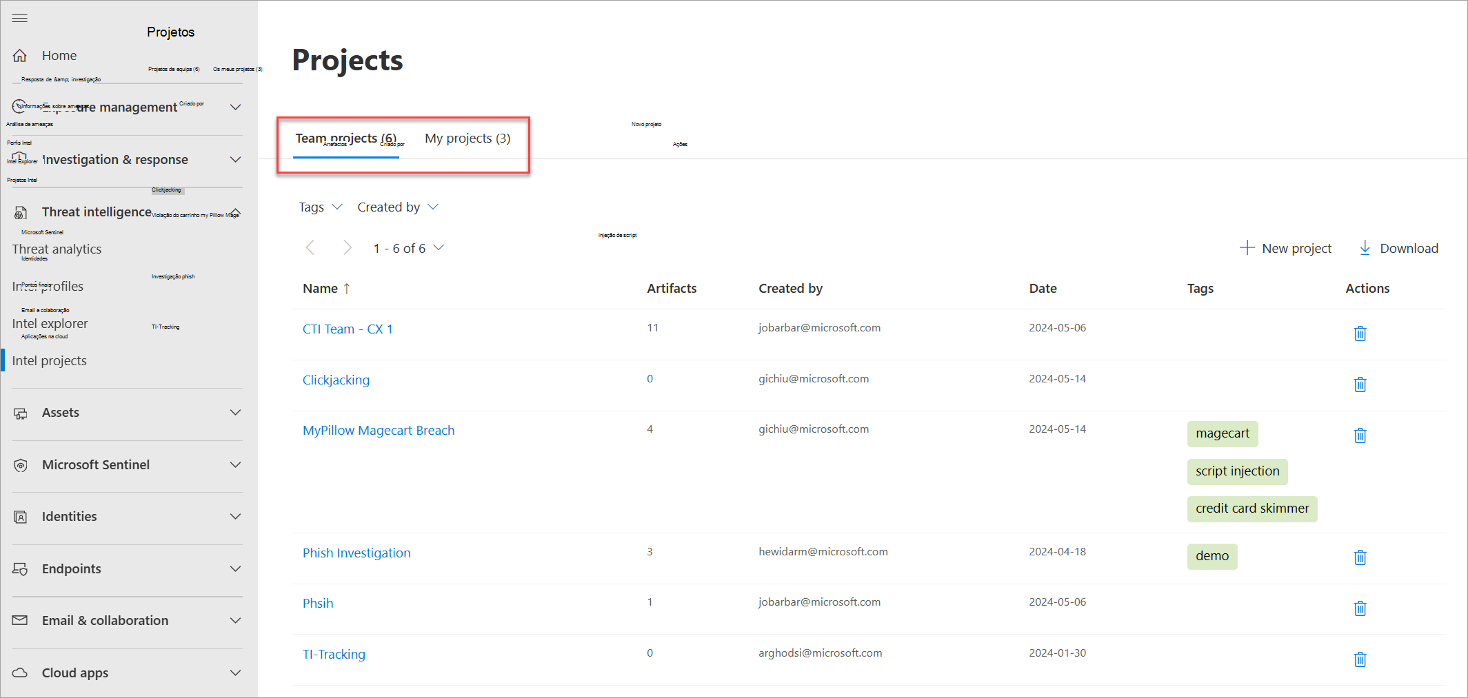 A página Projetos Intel mostra-lhe os projetos que possui ou que foram partilhados consigo por outros utilizadores do Defender TI no seu inquilino.