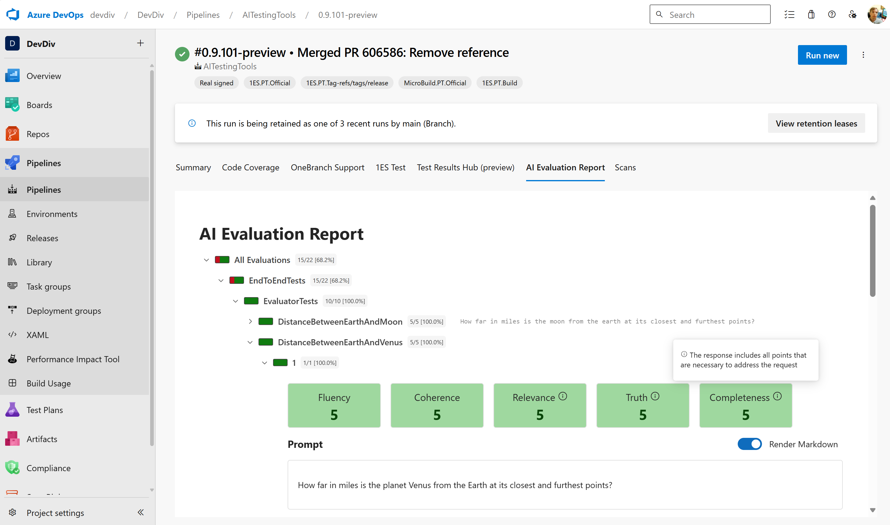 A biblioteca contém suporte para armazenar resultados de avaliação e gerar relatórios. A imagem a seguir mostra um relatório de exemplo em um pipeline de DevOps do Azure: