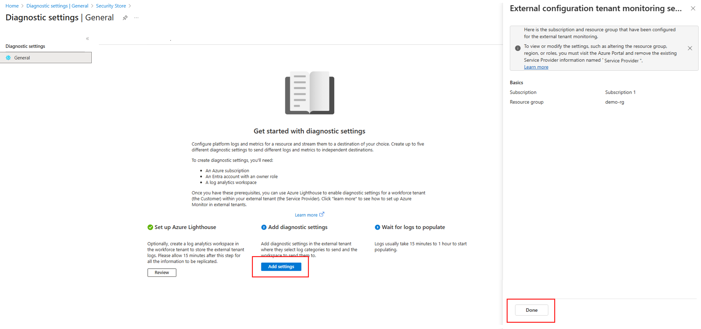 Para configurar o Azure Lighthouse em um locatário externo, inicie o assistente na página Configurações de diagnóstico ou na página Repositório de segurança . Escolha uma das seguintes abas com pontos de entrada para começar.