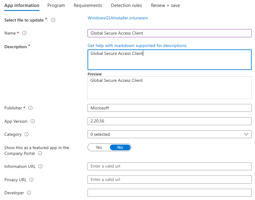 O nome do .exe ficheiro deve ser GlobalSecureAccessClient.exe para que o script de instalação do PowerShell funcione corretamente. Se modificares o nome do .exe ficheiro para outro, também tens de modificar o $installerPath no script PowerShell.