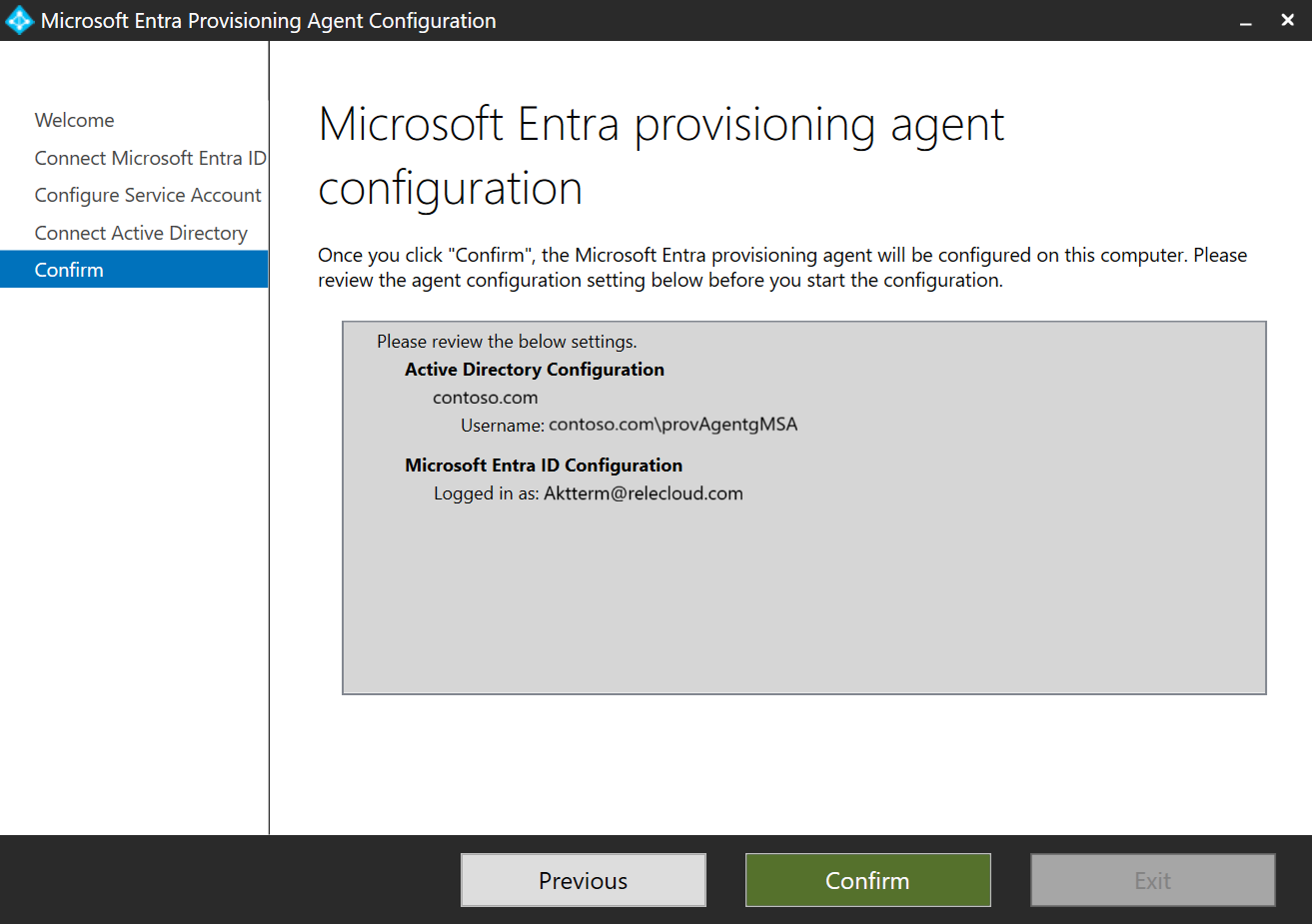 Na tela Configuração concluída , selecione Confirmar. Esta operação registra e reinicia o agente.