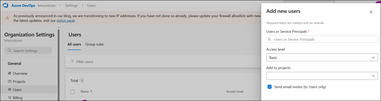 - Navegue até Configurações da organização -> Usuário -> Adicionar usuários