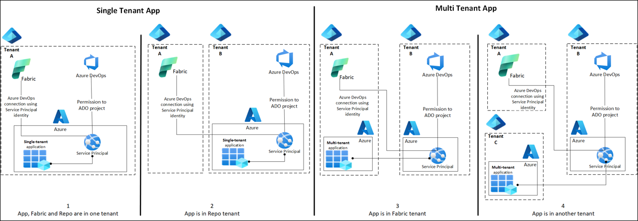 | 4 - Fabric, DevOps e aplicativo residem em locatários diferentes | Contas em qualquer diretório organizacional - aplicativos multilocatários | Crie o Service Principal no locatário do Azure DevOps. Ver exemplos. |