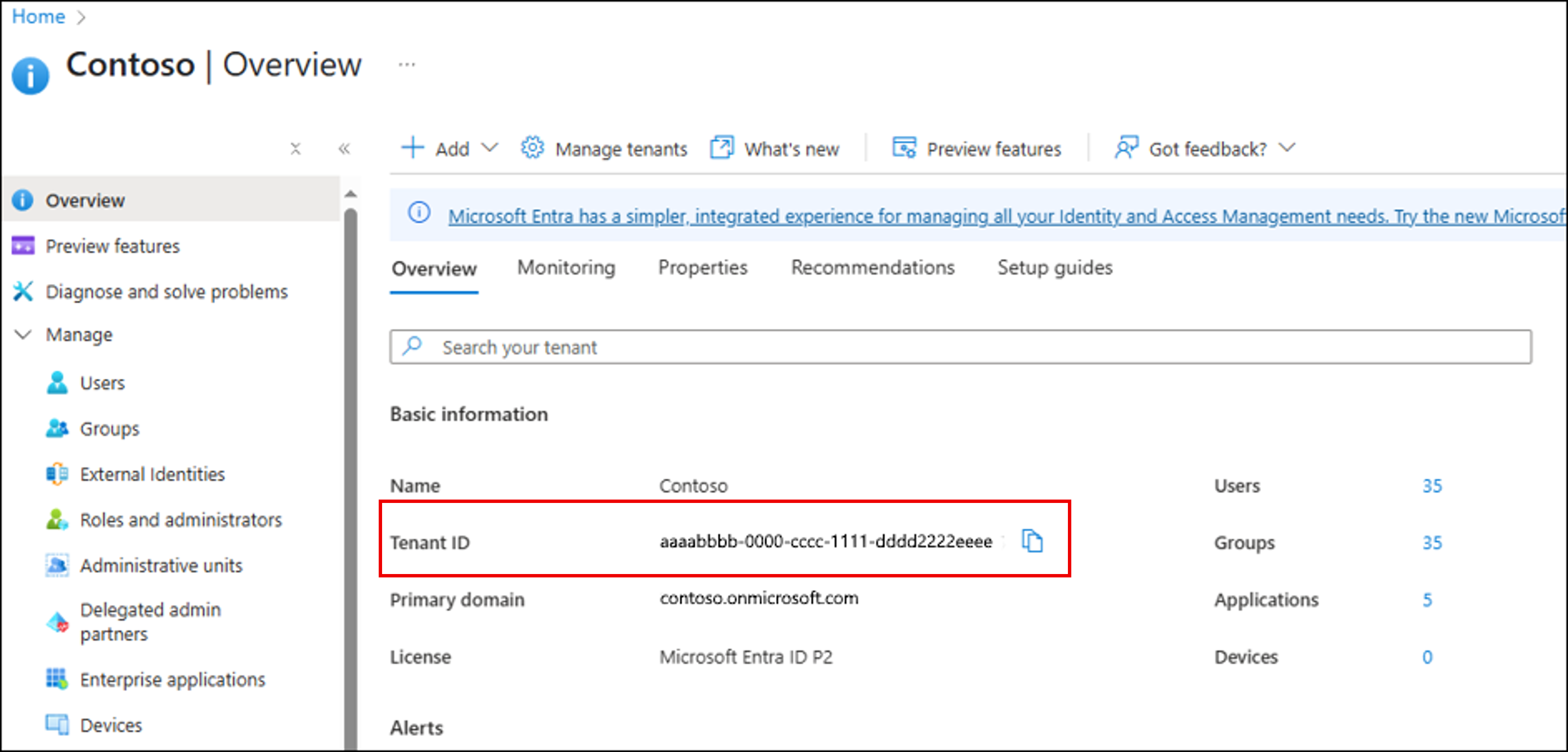 Para obter outras maneiras de obter a ID do locatário, consulte Como encontrar sua ID de locatário do Microsoft Entra.