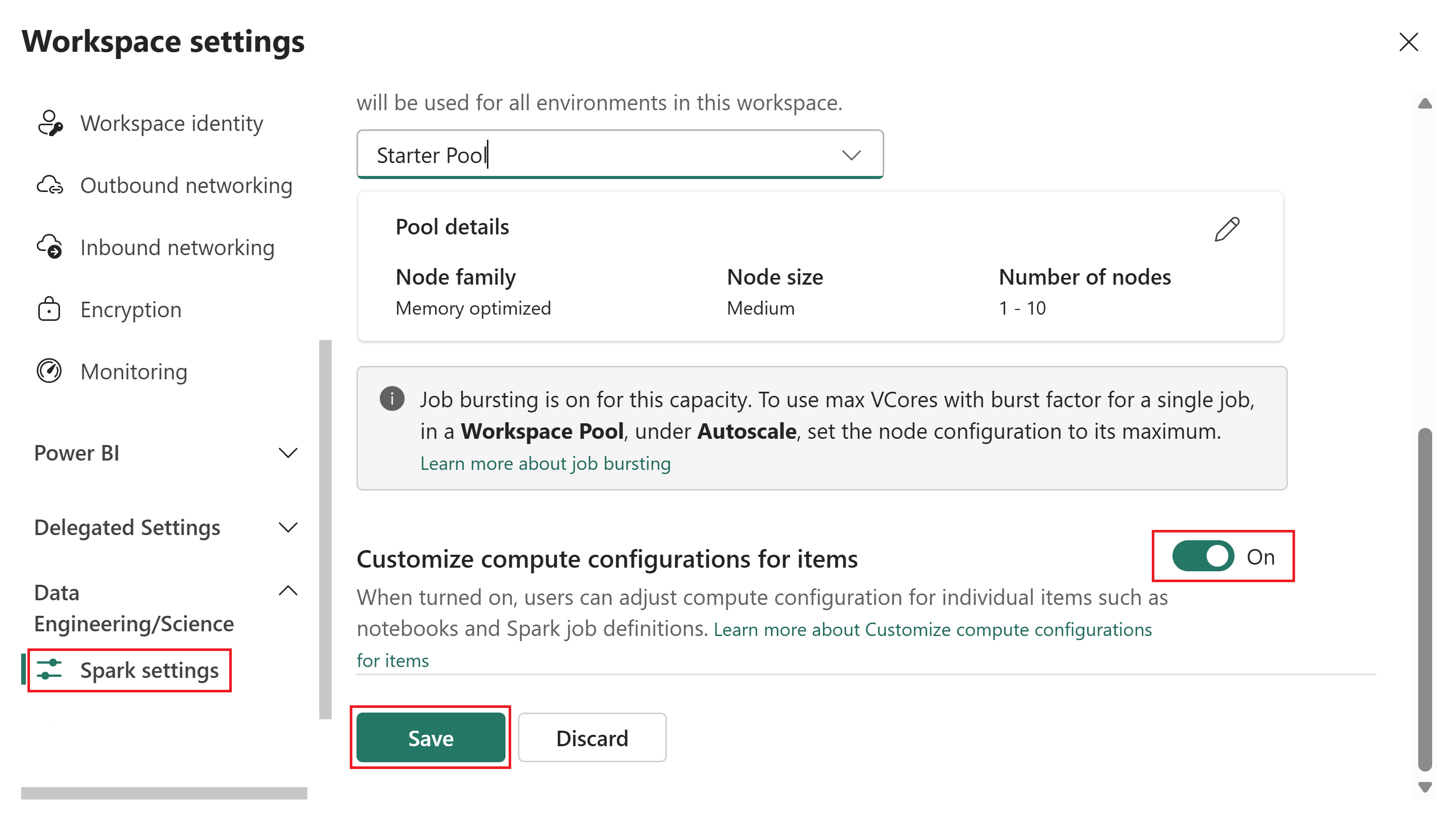 Selecione Engenharia de Dados/Ciência e depois selecione definições do Spark.