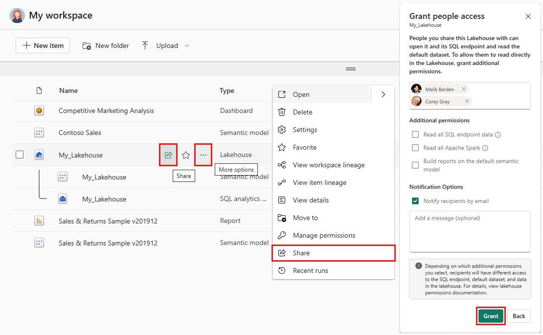 Para compartilhar uma casa no lago, navegue até o espaço de trabalho e selecione o ícone Compartilhar ao lado do nome da casa do lago. Você também pode selecionar as reticências (...) e, em seguida, no menu Mais opções, selecionar Partilhar. Preencha os campos no ecrã Conceder acesso a pessoas e selecione Conceder.