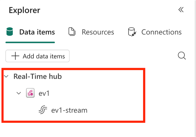 Depois de adicionar o elemento de fluxo de eventos, ele aparecerá no nó hub Real-Time no explorador de objetos do teu caderno com o nome do item; ao expandir o nó, verás o fluxo padrão ou derivado dentro do item de fluxo de eventos.