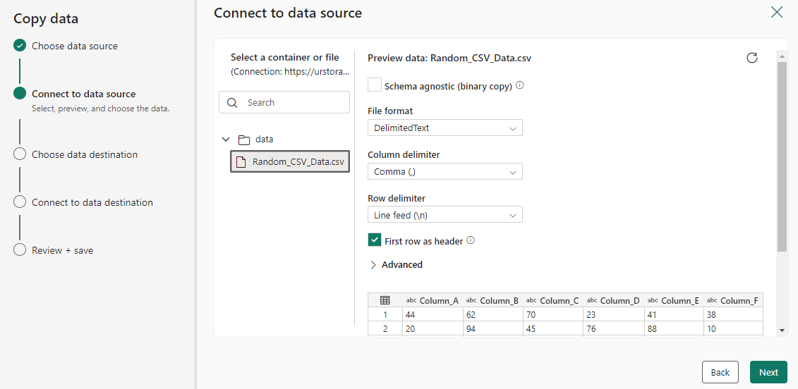 Configure e mapeie os dados de origem para o seu destino. Em seguida, selecione Avançar para concluir as configurações de destino.