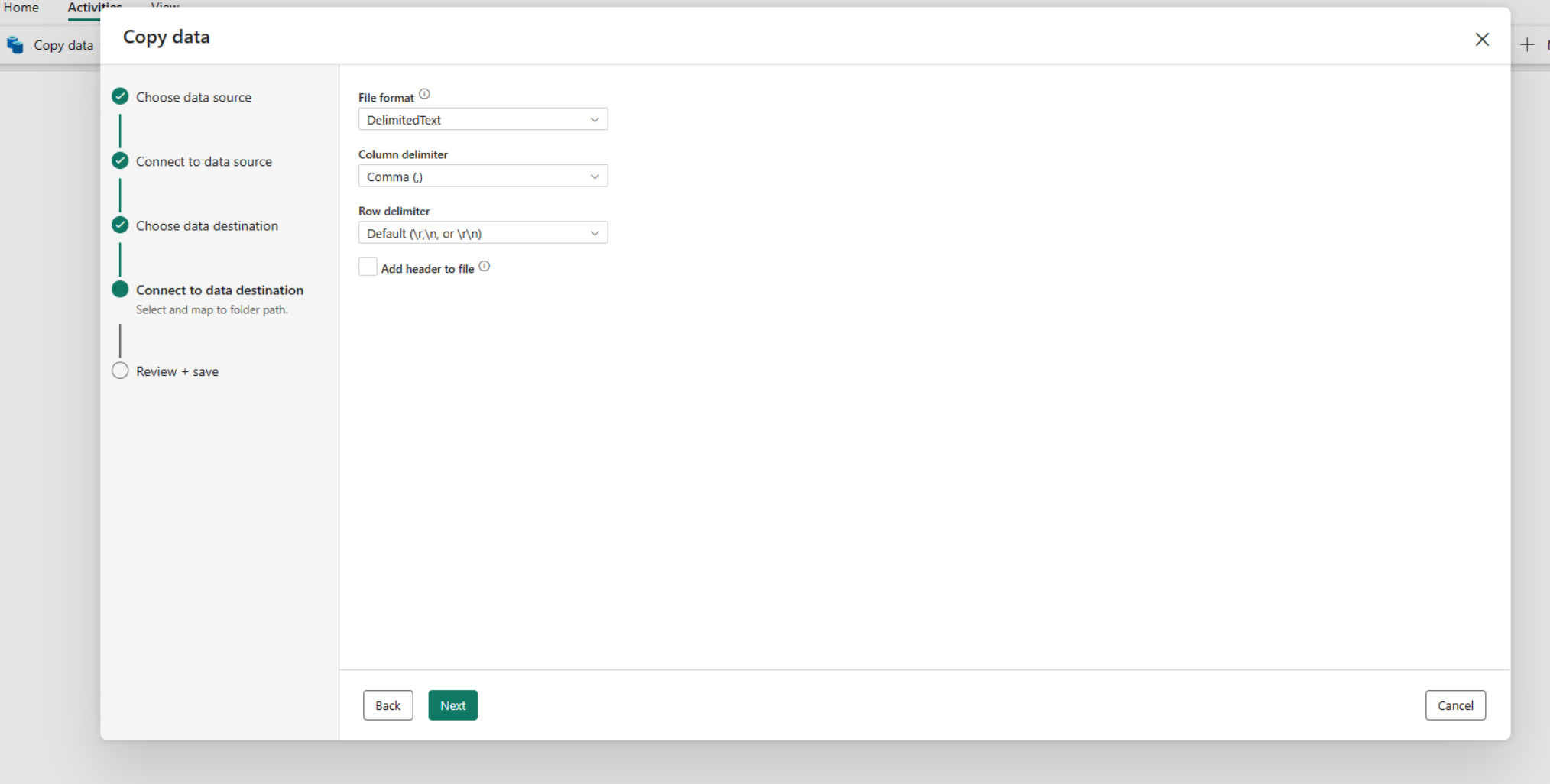 Revise as configurações de atividade de cópia nas etapas anteriores e selecione OK para concluir. Ou você pode voltar às etapas anteriores para editar suas configurações, se necessário, na ferramenta.