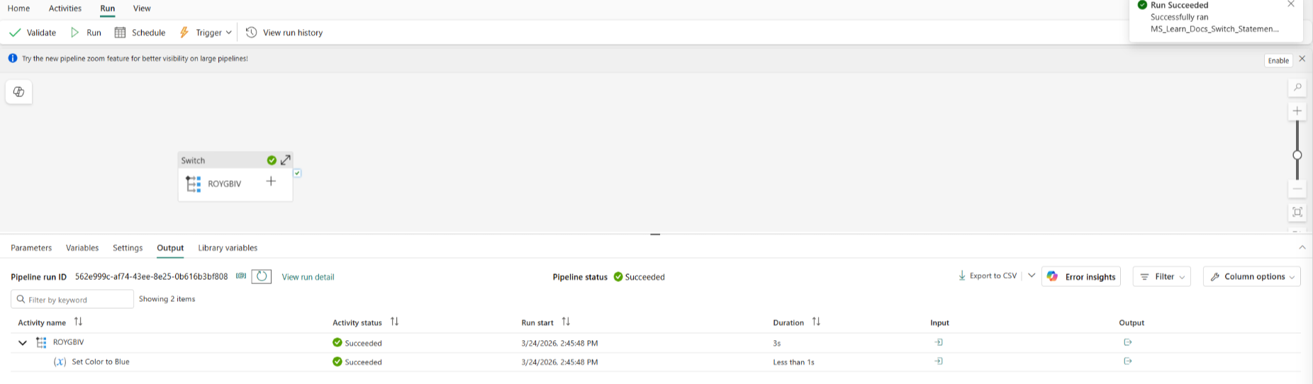 Após uma execução bem-sucedida do pipeline com "blue" como entrada, podemos ver na saída da atividade da variável Set no caso "Blue" que v_output foi definida para "Blue", confirmando que a atividade do switch avaliou a expressão e executou o caso correto.