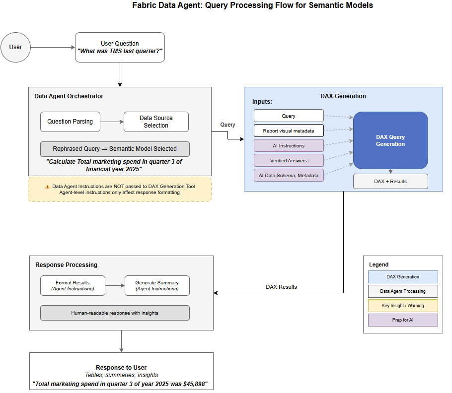 Ao consultar modelos semânticos, a ferramenta de geração DAX usada pelo agente de dados baseia-se exclusivamente nos metadados do modelo semântico e nas configurações de preparação para IA. A ferramenta de geração DAX ignora quaisquer instruções que adiciones ao nível do agente de dados para geração de consultas DAX. Uma preparação adequada para a configuração da IA é essencial para obter resultados precisos.
