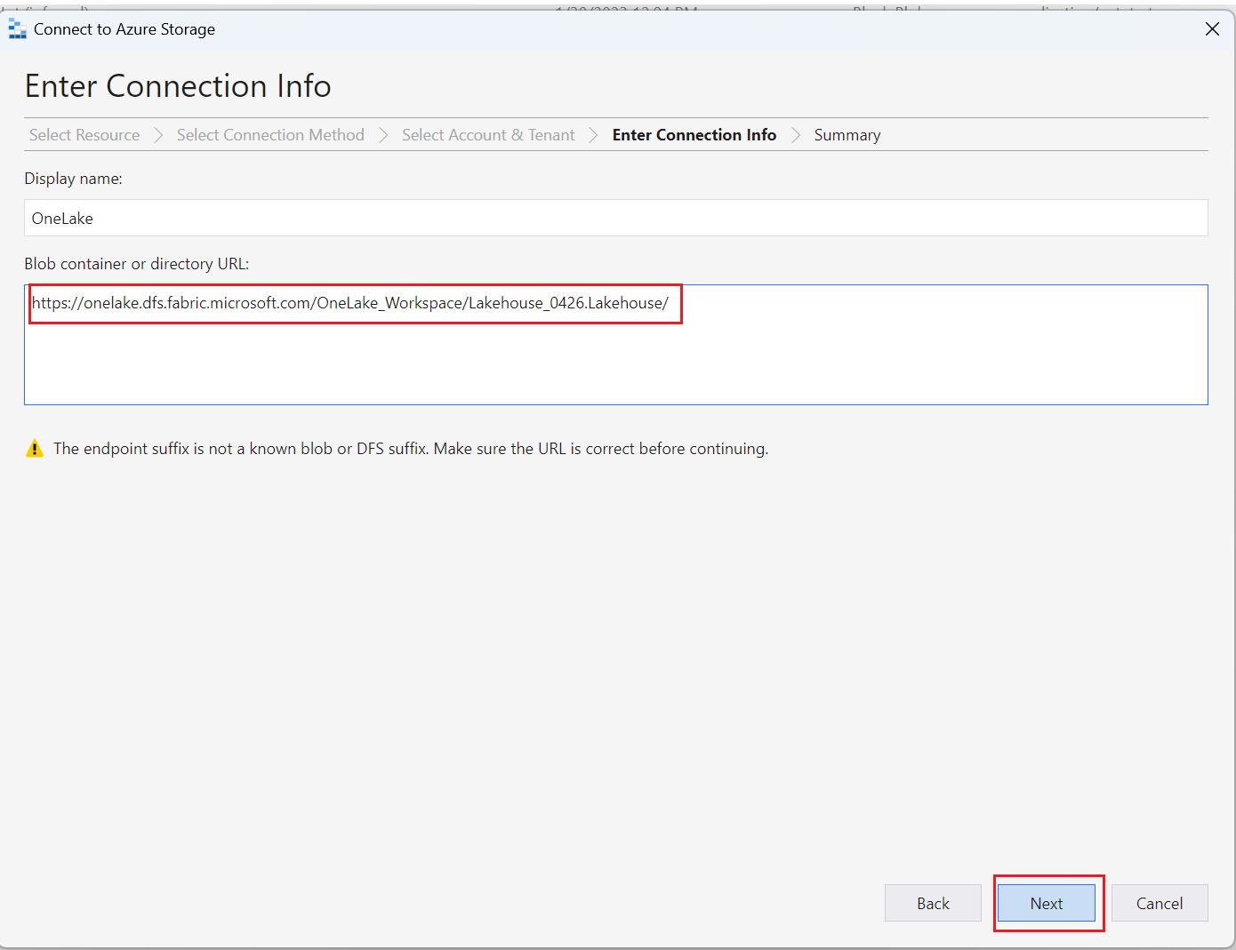 https://onelake.dfs.fabric.microsoft.com/{workspace-Name}/{itemName.itemType}/. Você pode encontrar o nome do espaço de trabalho e o nome do item no painel Propriedades de um arquivo no portal do Microsoft Fabric.Você pode escolher um Nome para exibição por conveniência e, em seguida, selecionar Avançar.