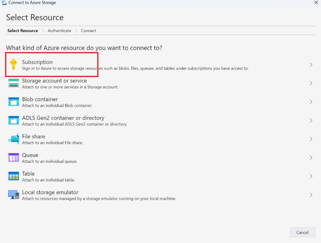 O Gerenciador de Armazenamento do Azure exige que você entre para se conectar aos recursos do Azure. Selecione Subscrição e siga as instruções para iniciar sessão.