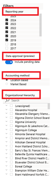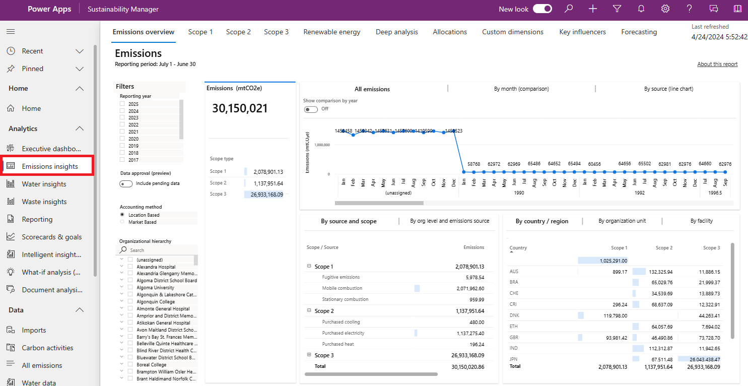 Para filtrar o dashboard Informações sobre emissões , faça seleções no **Ano de relatório, Método de gestão contabilística e Hierarquia organizacional.
