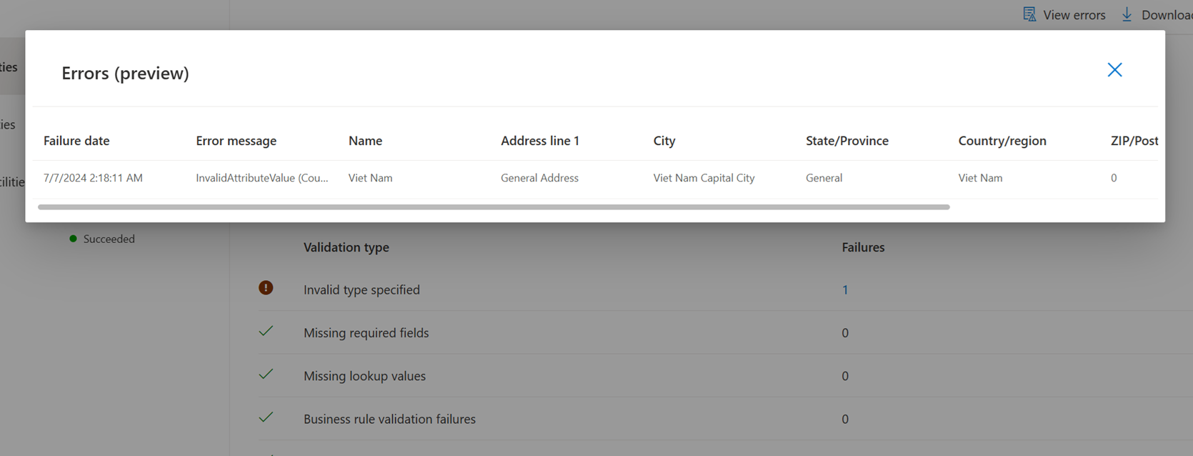 Para ver uma pré-visualização dos erros na página, selecione o número na coluna Falhas ou selecione Ver erros. O pop-up Erros (pré-visualização) aparece.