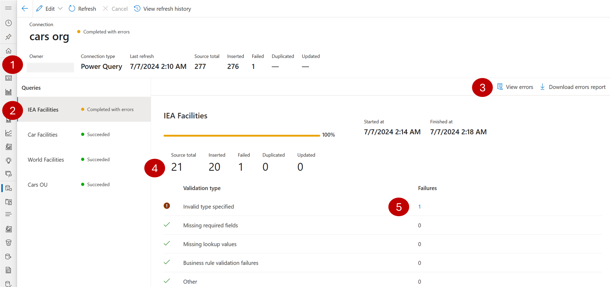 | 5 | Listagem de erros, que pode selecionar para obter detalhes. |