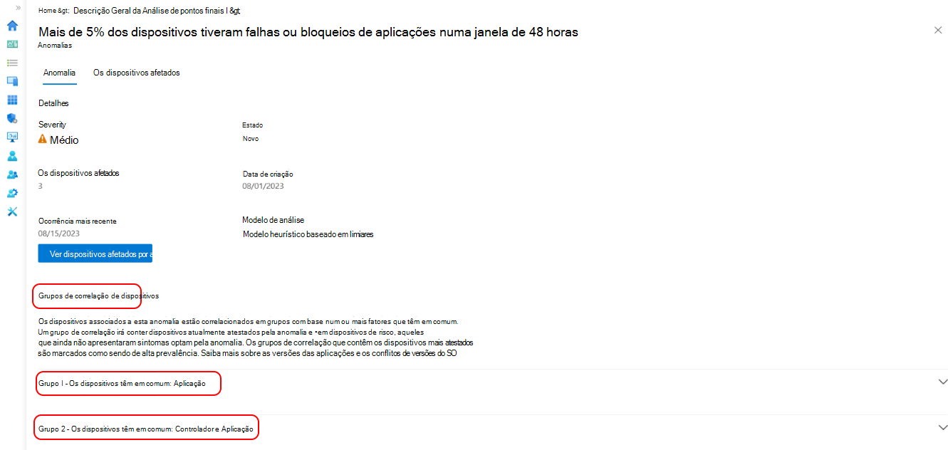 - Para ver mais informações sobre uma anomalia específica, selecione-a na lista. Reveja os detalhes, como o nome da aplicação, os dispositivos afetados, quando o problema foi detetado pela primeira vez e o último, e quaisquer grupos de dispositivos que possam estar a contribuir para o problema.