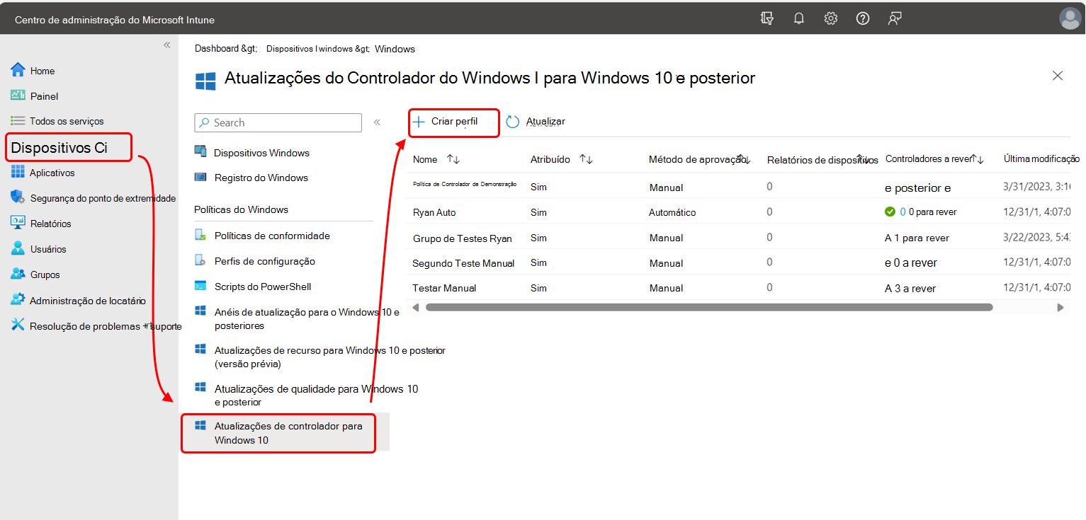 Inicie sessão no centro de administração do Microsoft Intune e aceda a Dispositivos>Por plataforma>>Windows Gerir atualizações>Windows 10 e atualizações posteriores> separadorAtualizações do controlador e selecione Criar perfil.